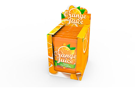 Envases diseñados para exhibir y resaltar la variedad en sobres de jugos sobre el punto de venta con facilidad de acceso y reposición.